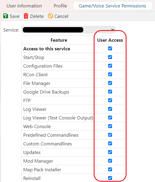 To rectify this, edit your sub-user and navigate to the "Game/Voice Service Permissions" tab. Simply make sure that the "Access to this service" is ticked and then press "Save". Your sub-users should now be able to see your server in the game panel. You'll also want to make sure that you have chosen the right service in the "Service" dropdown.