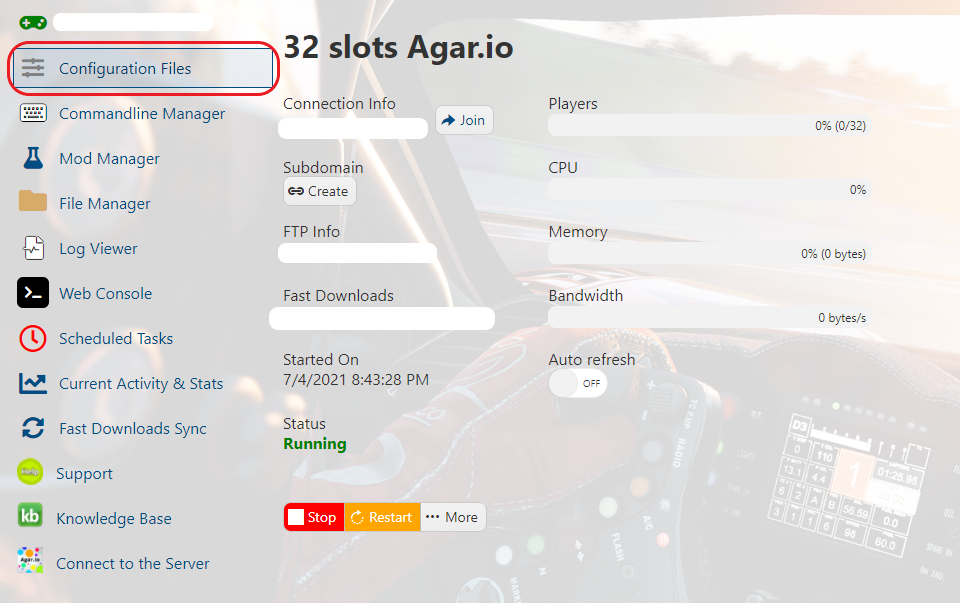 To begin configuring your Agar.io server, head over to your "Configuration Files" after logging into the control panel.