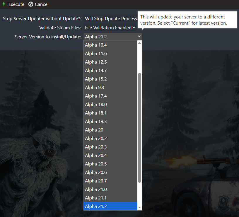 4. On the server updater, click Server Version to Install/Update and select your preferred version.