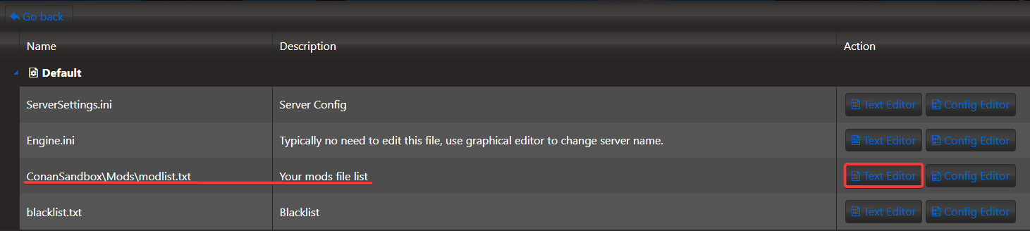 5. On the Configuration files, open modlist.txt and click the Text Editor.